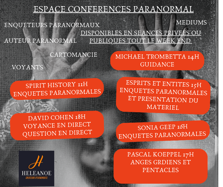 Tout le week-end, retrouvez des conférences fascinantes animées par des spécialistes du paranormal, de la médiumnité, de l’ésotérisme, de l’énergie et des phénomènes inexpliqués.